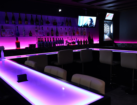 「AROMA」の店内は、紫やピンクのライトが柔らかく輝き、幻想的なムードを生み出しています。派手すぎず、ほどよい妖しさが漂う空間は、まるで異世界に迷い込んだような感覚。カウンターに座ると、照明の光がグラスに反射し、より一層お酒が美味しく感じられますよ。
