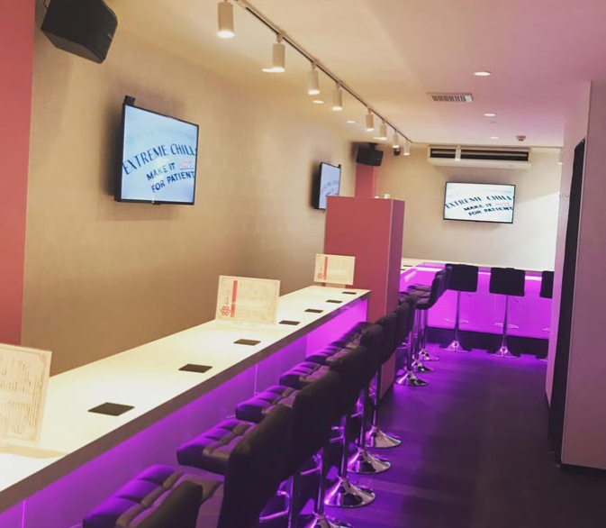 - 黒を基調とした落ち着いた店内に青い照明が映える洗練された空間
