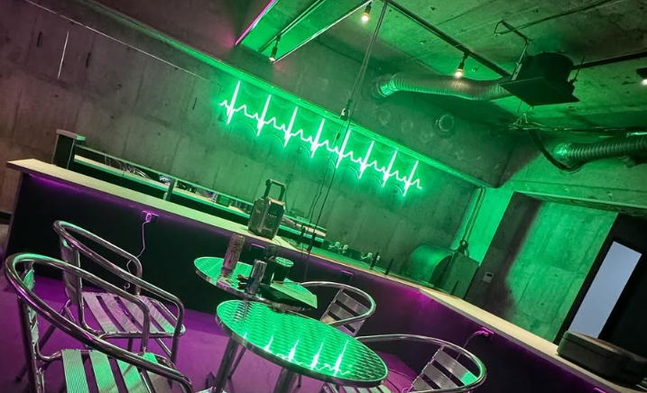 店内は、コンクリート打ちっぱなし風の壁にネオンライトが映えるスタイリッシュなデザイン。幻想的な照明と落ち着いた雰囲気が融合し、まるで異世界に迷い込んだような空間が広がっています。おしゃれで洗練された店内は、ひとりでしっぽりと飲むのにも、仲間と盛り上がるのにも最適。シックな内装の中でお酒を嗜みながら、心地よい時間を過ごせますよ。